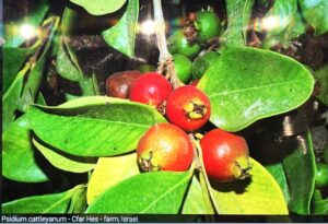 Een plant die groeit in Israel, en in Kew Gardens Engeland, en in de Hortus Botanicus in Leiden. Daar groeit deze plant in een hoekje achter de grote kas, naast het water van de Doelengracht, dat op die plek in de Hortus komt. De naam: Psidium cattleyanum Sabine. (Sabine is de persoon die deze plant deze naam heeft gegeven! Deze naam heeft hij in 1821 gekregen).